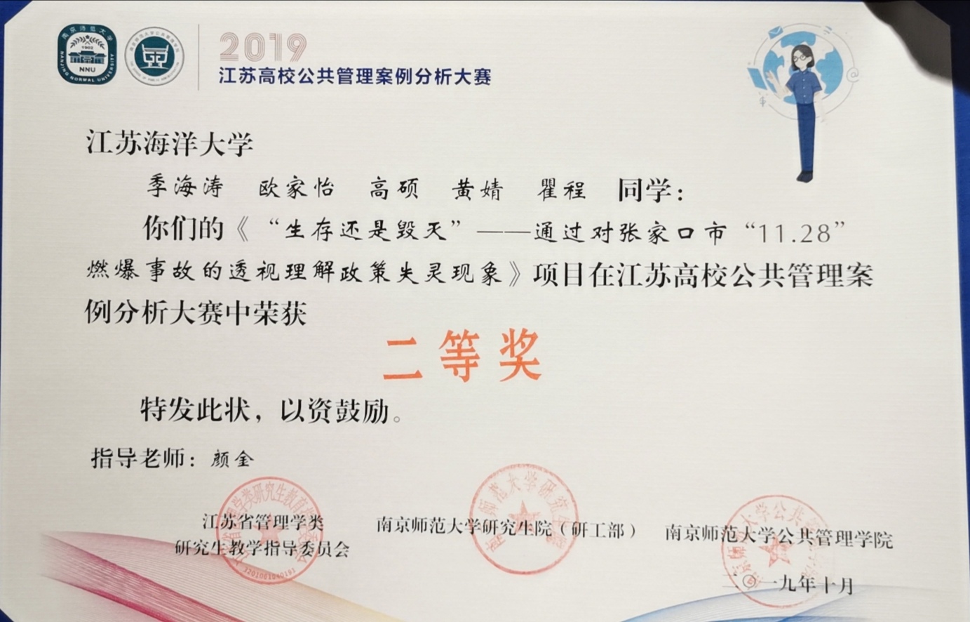 10月11日,首届江苏高校公共管理案例分析大赛决赛在南京师范大学公共管理学院落下帷幕,我校法律与公共管理学院“最美逆行队”的案例作品荣获大赛二等奖。