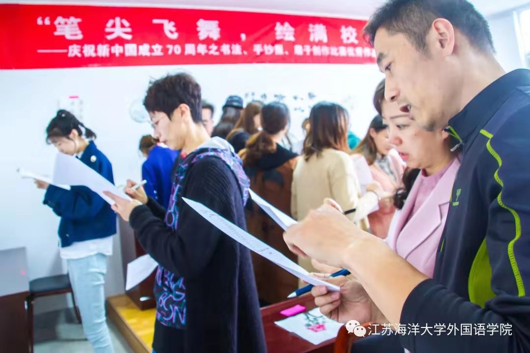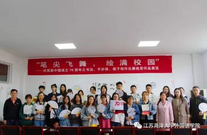 10月12日下午,由外国语学院团委宣传部主办的“笔尖飞舞,绘满校园”庆祝新中国成立70周年书法、手抄报、扇子创作比赛的作品于苍梧校区文渊楼269进行展览。活动现场邀请学院领导、党政办、教学办、辅导员等老师和海洋生命和水产学院学生团委副书记冷超凡同学前来参观并进行投票。
