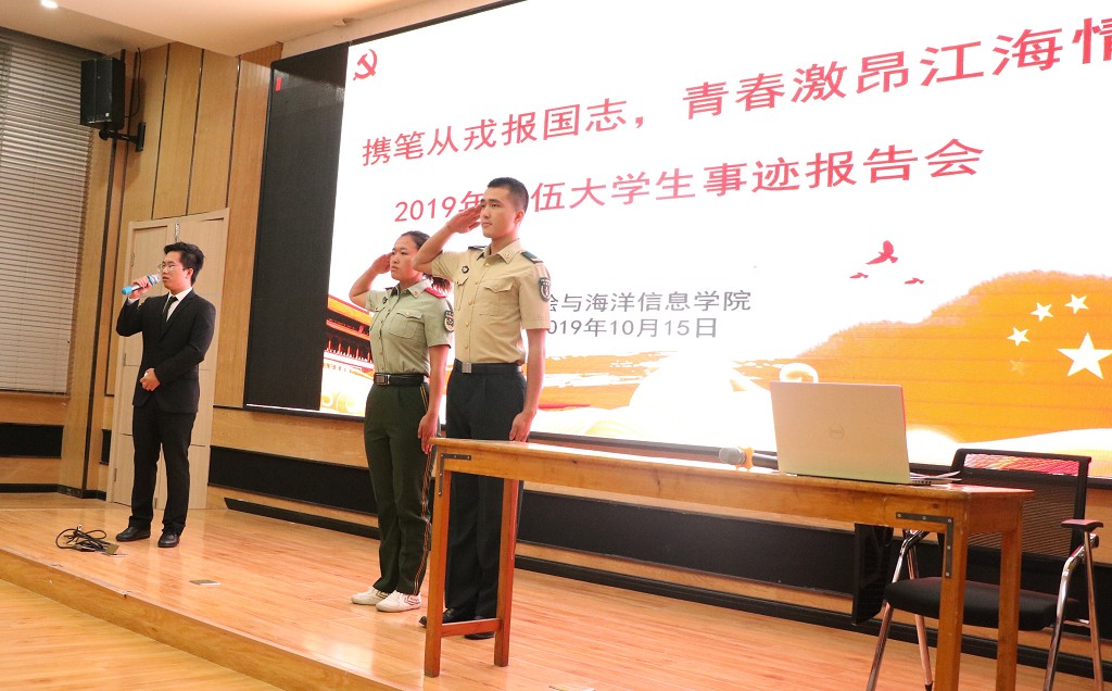 10月15日晚,测绘与海洋信息学院在通灌校区路演大厅举办“携笔从戎报国志,青春激昂江海情”2019年大学生退伍军人事迹报告会。学院党委副书记王晶和校武装部国防教育科科长刘玉良出席,2019级全体新生聆听了报告会。