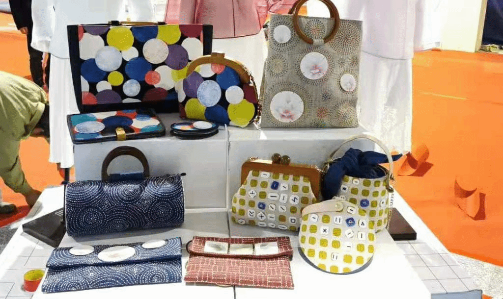 除此之外,还有来自陶艺工作室的《妤意系列手工包》《谛山海》等作品,《谛山海》通过白瓷、树脂、青花等多种材料进行自然结合而衍生出茶台、茶具、壁挂、笔架、书签、首饰等一系列产品,将港城的山海元素完美的融合在一起,时尚而不失典雅。《妤意系列手工包》将非遗元素融入现代人们的生活中,让人们可以更多地接触到非遗,了解非遗,从而对非物质化遗产进行更好地传承发展,弘扬文化。