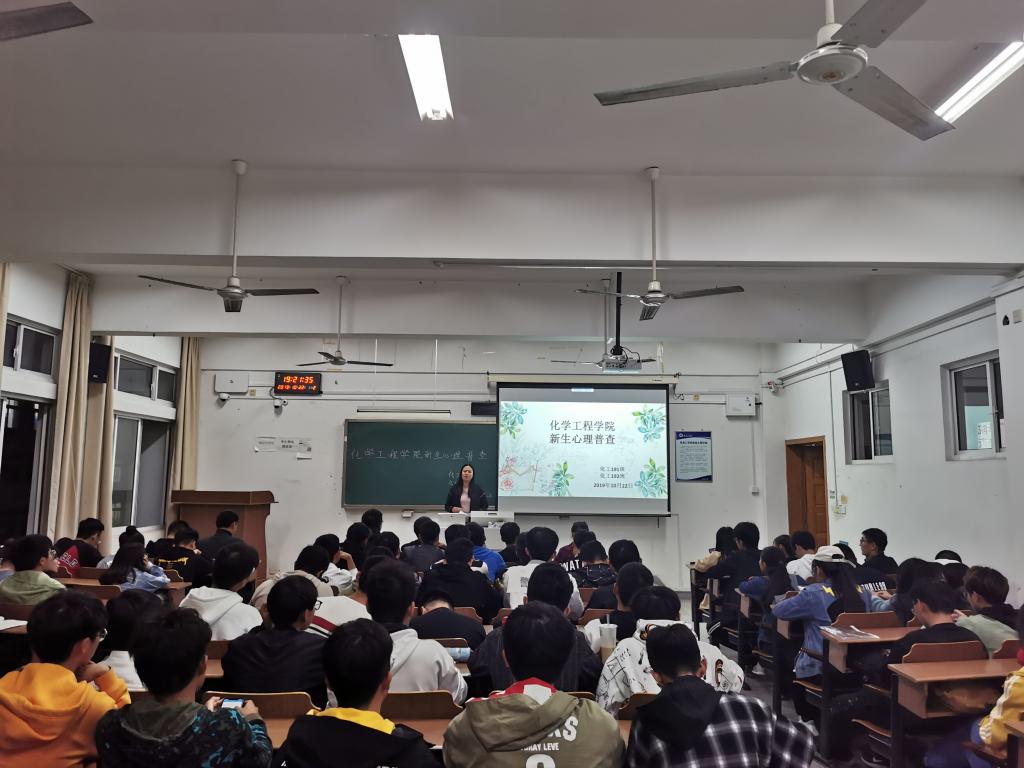10月22日晚,化学工程学院于文通楼317、319和321教室分别进行2019级新生心理普查活动。化学工程学院党委副书记王改红、分管学院心理工作的辅导员王学梅老师出席活动。化学工程学院2019级200余名新生全部参加测试。