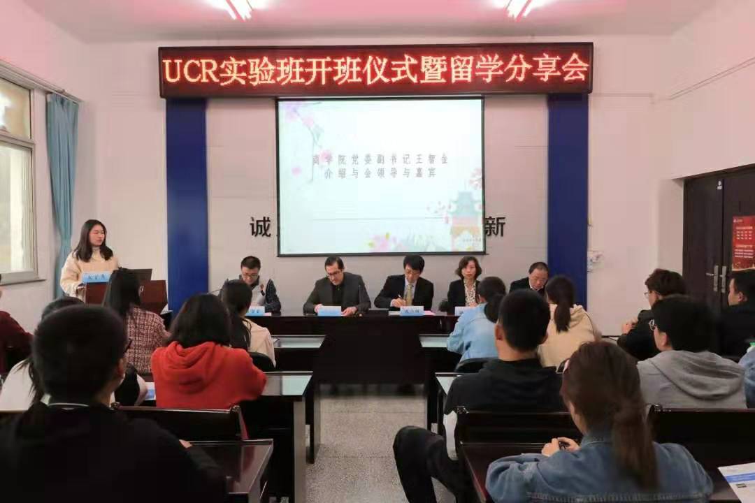 10月30日下午,UCR 2019级实验班开班典礼暨留学分享会在文渊楼商学院357会议室隆重召开。UCR安德森商学院副院长、国际关系部主任陈少辉,UCR安德森商学院招生部主任Mark Estrada,我校国际交流与合作处处长、国际学院院长韩小杰,商学院院长宣昌勇,相关辅导员及全体UCR实验班商学院成员出席本次会议。会议由商学院党委副书记王智金主持。