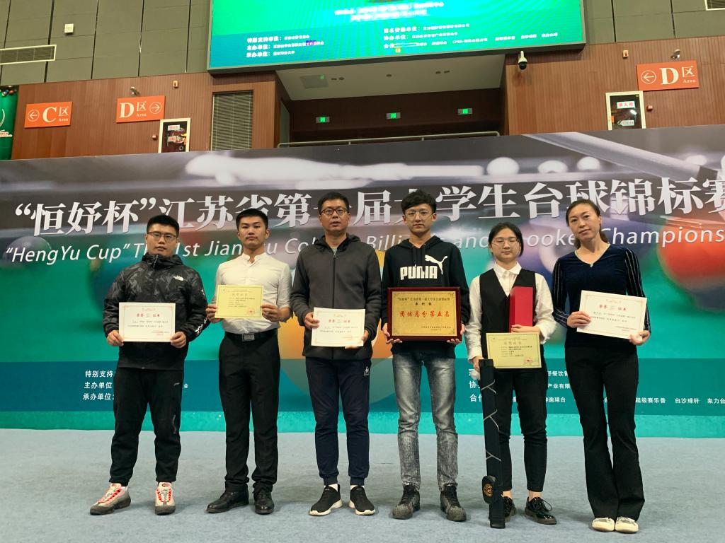 11月1-3日,由江苏省学生体协高校工作委员会主办,南京审计大学承办的“恒妤”杯江苏省首届大学生台球锦标赛在南京审计大学体育馆举行,本次比赛吸引了省内近三十所高校参加。我校派出4名同学参加了中式台球、美式九球和斯诺克的比赛,经过三天的激烈角逐,艺术学院的许祖妍同学斩获女子美式九球亚军,海洋生命与水产学院的张伟同学获得男子美式九球第五名,并夺得团体总分第五名的优异成绩。比赛中队员们敢打敢拼、沉着冷静,向全省高校展现了江苏海洋大学的学子风采。此次比赛,朱江、魏芳艳两位老师获得了“优秀教练员”称号。