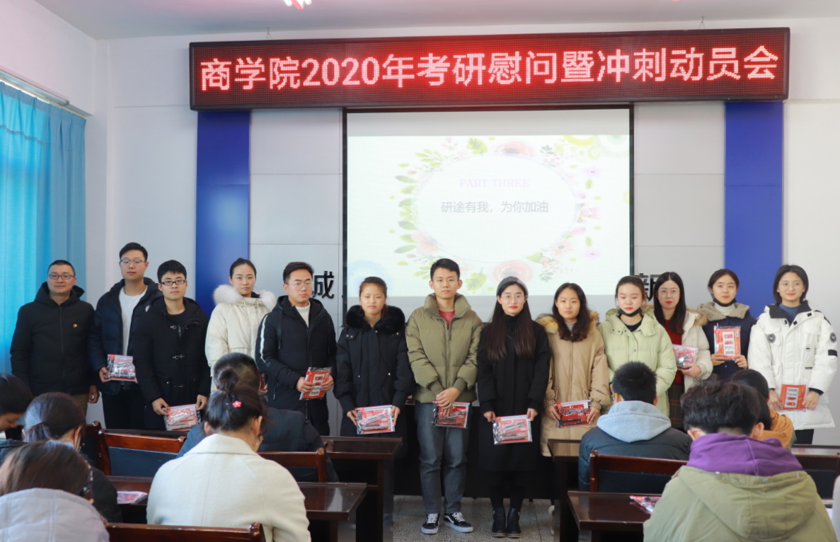12月11日下午,商学院在会议室召开2020年考研慰问暨冲刺动员大会。商学院党委书记杨天华,党委副书记王智金,副院长孙军出席了动员会,对商学院2020年考研同学进行了慰问。商学院部分考研学生代表参加了动员会。