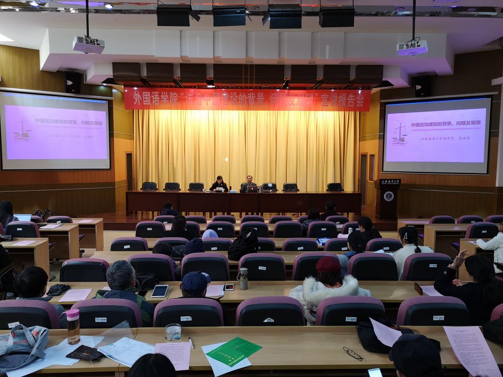 12月11日下午,外国语学院在讲堂楼报告厅开展政治理论学习活动。邀请校理论宣讲团成员吴建国博士作了题为“中国法治建设的背景、问题及展望”的报告。学院全体教职工聆听了报告,党委书记徐岚主持了报告会。