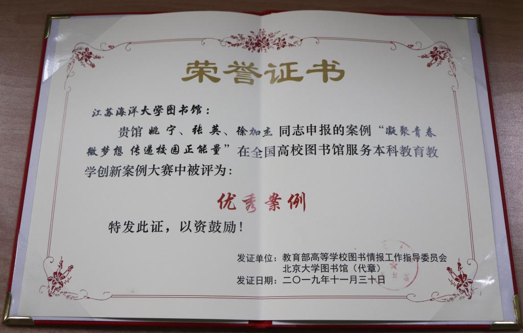 此次会议在开展工作研讨的同时,征集、评选和展示了高校图书馆服务本科教育教学创新优秀案例,征集到的案例经专家组评审后,将进入“高校图书馆服务本科教育教学案例库”。本次征集的案例经专家组评审,共评选出20个最佳案例、30个特色案例、92个优秀案例。校图书馆艾华、 张英、 姚宁 、黄小涛、 王启云 、田为付 、徐加杰 、陆芳芳同志申报的案例“培养阅读习惯 建设书香校园”,艾华 、张英 、姚宁 、赵犟军、 陈韵竹、 王秋雅、 葛丽玲、 孙静同志申报的案例“凝聚青春微梦想 传递校园正能量(图书馆官微)”在全国高校图书馆服务本科教育教学创新案例大赛中被评选为“特色案例”,发证单位为教育部高等学校图书情报工作指导委员会。