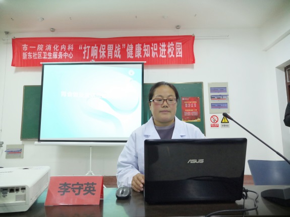 李守英详细介绍了胃食管反流病的症状,给师生们展示了食管病变图片,让师生们全方位的认识了胃食管反流病。李守英博士特别指出,师生们在生活中一定要饮食规律,切不可吃完饭就躺下、晚饭不宜吃的过晚等生活中我们应注意的不良习惯,这些不良习惯很容易引起肠胃的疾病。李守英还介绍了一些治疗胃病的药品,介绍了不同药品的药效与服用时间,提醒师生们患病后不能有心理压力,应当调整心态,及时就医,李守英的讲座让师生们对胃病有了深刻的了解,认识到平时生活中的不良习惯是引起胃病的重要原因。