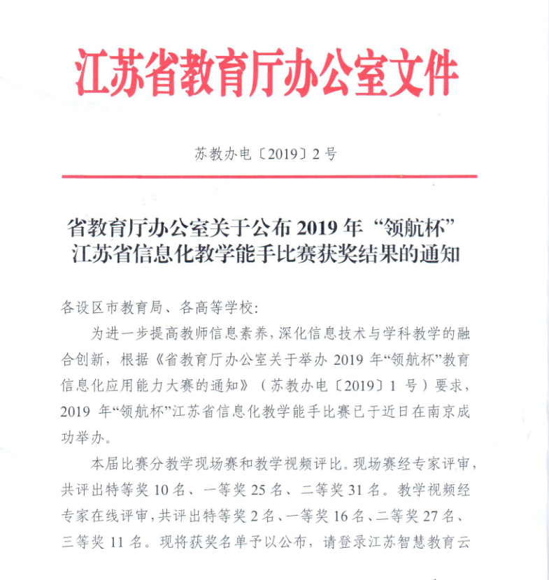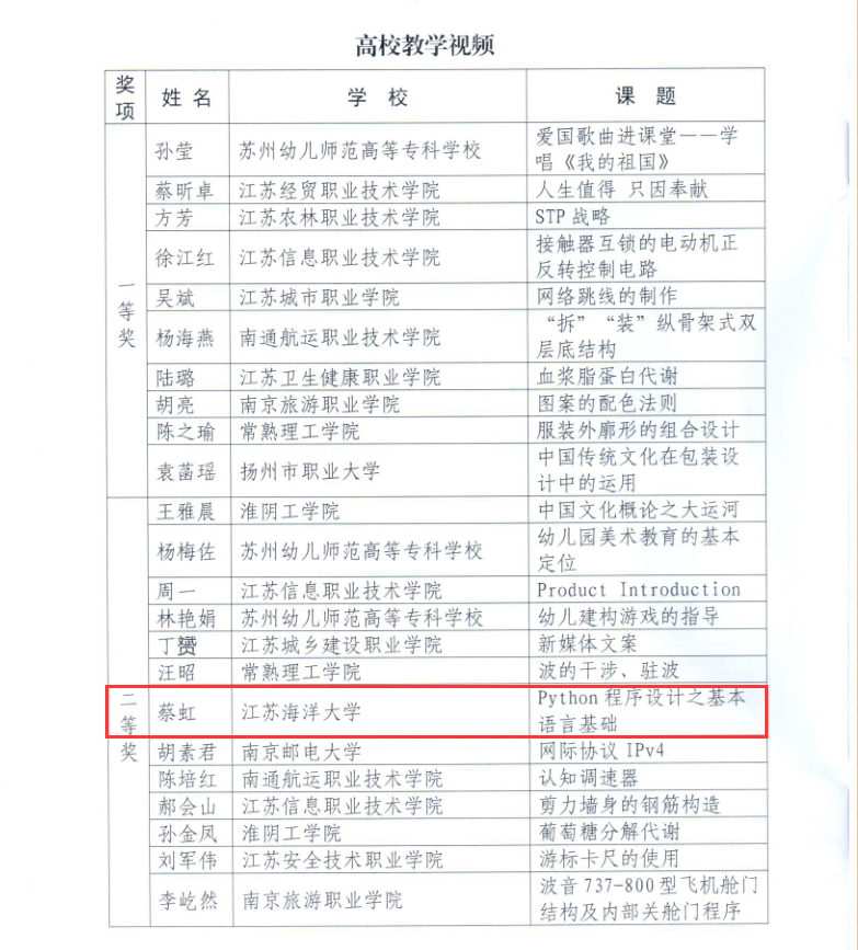 据“省教育厅办公室关于公布2019年‘领航杯’江苏省信息化教学能手比赛获奖结果的通知(苏教办电〔2019〕2号)”精神,我校蔡虹老师的《Python程序设计之基本语言基础》荣获高校教学视频二等奖。