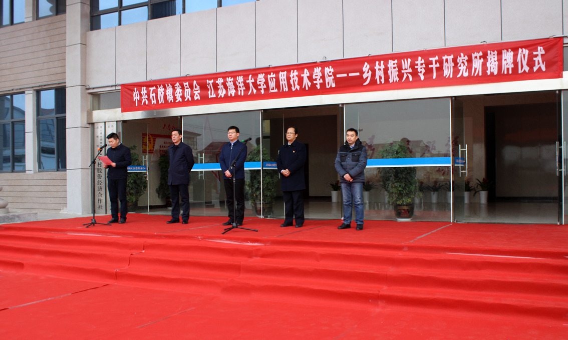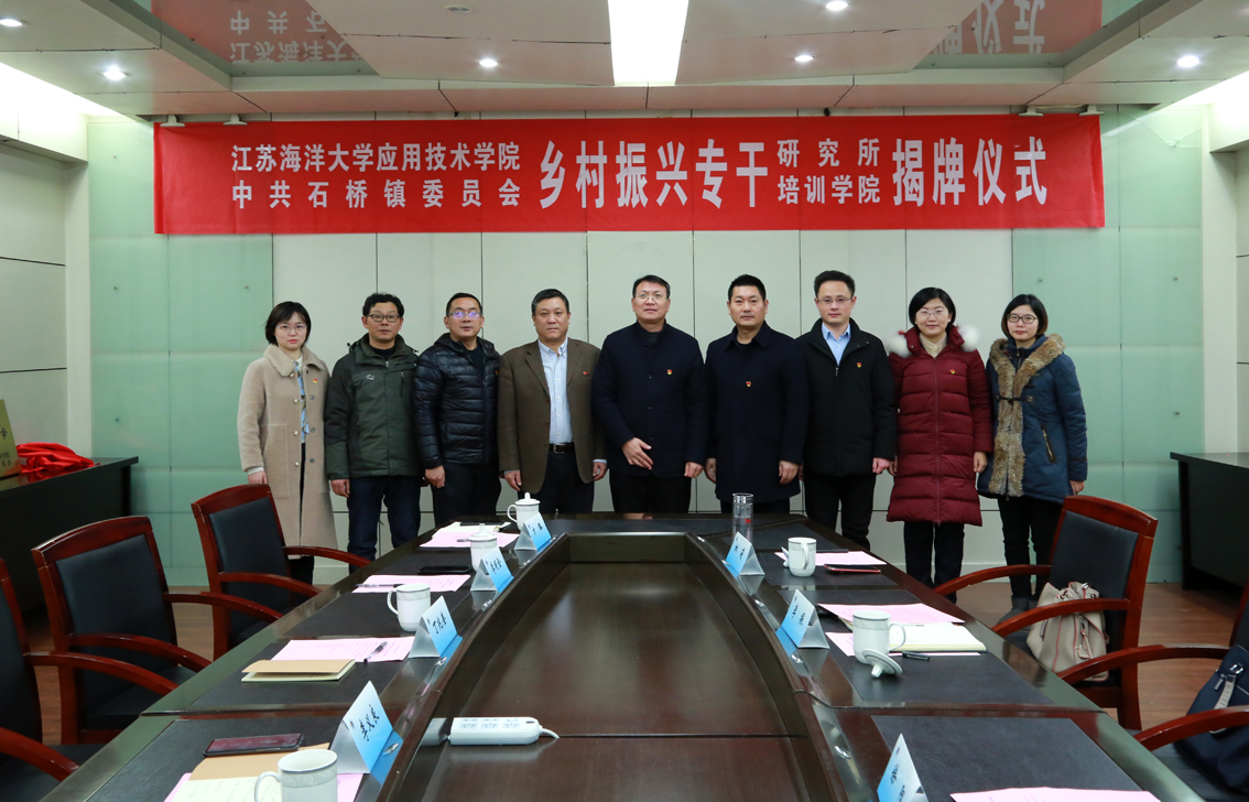 1月16日,江苏海洋大学应用技术学院、中共石桥镇委员会乡村振兴专干研究所、乡村振兴专干培训学院揭牌仪式在赣榆区石桥镇与宋跳校区两地同步举行。
