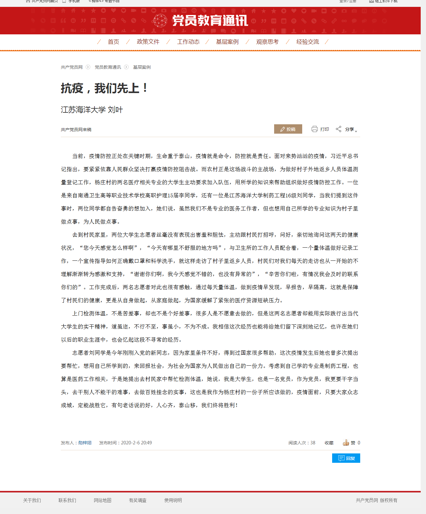 然而,一场突如其来的新冠肺炎疫情让鼠年的春节有些不同。刘叶所在的南通市杨庄村外地返乡人员较多,防控形势不容乐观。面对来势汹汹的疫情,来不及多思考,2月5日,刘叶主动要求加入疫情防控队伍,结合自己的专业知识帮助组织做好疫情防控工作。在村民家中,刘叶丝毫没有表现出害羞和胆怯,主动跟村民打招呼问好,亲切地询问这两天的健康状况,“您今天感觉怎么样啊”,“今天有哪里不舒服的地方吗”。她配合卫生所的工作人员,一边量体温做好记录工作,一边宣传指导如何正确戴口罩和科学洗手。每天量体温、做记录,重复着最普通的事情,体现着最博大的奉献精神。道虽迩,不行不至,事虽小,不为不成。刘叶作为今年刚刚入党的新同志,在校期间多次获得国家、学校的帮助,疫情发生后她主动请缨,既是回馈国家、回馈社会的一种方式,也用行动诠释了一名党员的担当精神。刘叶面对疫情主动作为的事迹被共产党员网报道,赢得了网友们的点赞。