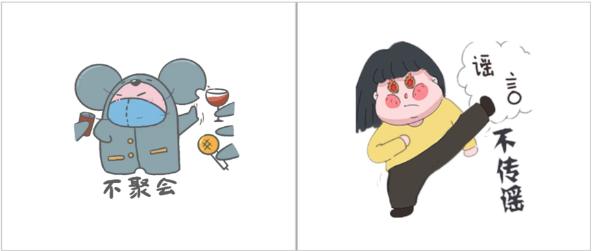 为助力防控工作,除了宣传海报外,东家智创工作室的师生还设计了“鼠来宝”“猪猪萍”“热干面”等“助力防控”系列表情包,意在通过群众喜闻乐见的形式,传播防疫知识,为武汉加油。表情包生动形象,富有寓意,融入了防控知识,饱含了对武汉的支持和关爱,充满了对“静待花开”的浓浓期待。