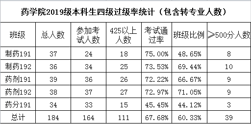 药学院2019级新生总计184人,报考164人,通过111人,报考通过率达到67.87%,班级通过率达60.33%,其中制药192班级通过率高达69.44%。药学院2016级毕业生共计170名,考研初试300分以上45人,350分以上21人,最高分424分,其中药剂161班考研300分以上人数21人,占班级总人数的50%。