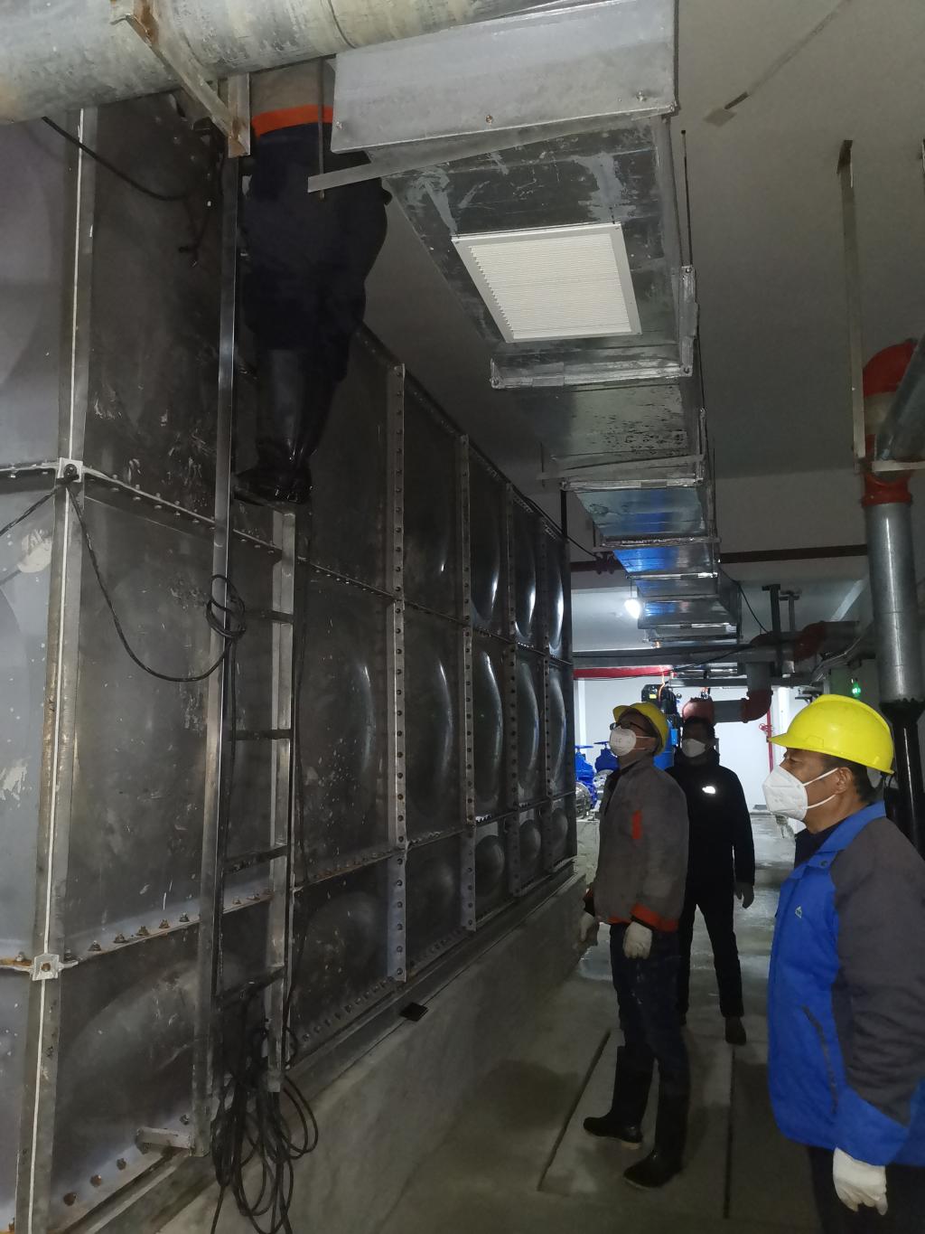 施工过程中,后勤第一党支部书记、水电科科长张启磐同志带领水电科党员同志冲锋在一线,一会儿爬到几十米高的水塔顶部,一会儿深入十来米的地下水池,检查清洗是否干净、消毒是否达标、设备运行是否正常,不放过每一个环节,紧盯每一个细节,张启磐和他带领的党员用自己的实际行动扛起肩上的使命担当。