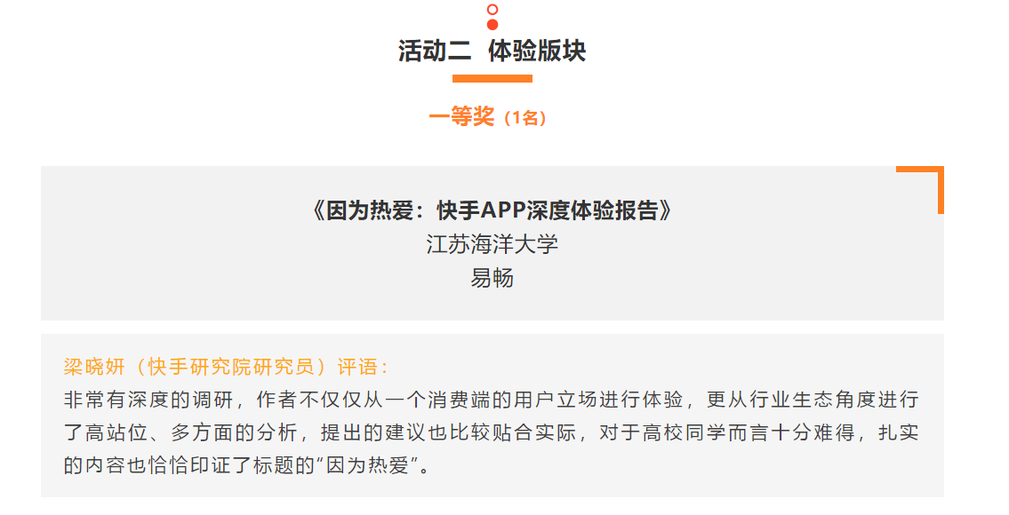 3月8日下午,由Remix教育、刺猬公社与快手公司联合百所高校发起的“百校万人快手体验周”活动评比结果揭晓,文学院邱立楠老师指导的新闻171班易畅同学的作品《因为热爱:快手app深度体验报告》,斩获体验报告类唯一的一等奖,将8000元大奖揽入怀中,北京大学、南京大学的学生作品荣获二等奖。易畅同学的作品,较好展现了文学院近年来新闻学应用型本科的培养模式,并获得了快手研究院研究员梁晓妍的高度评价,认为该体验报告是“非常有深度的调研,作者不仅仅从一个消费端的用户立场进行体验,更从行业生态角度进行了高站位、多方面的分析,提出的建议也比较贴合实际,对于高校同学而言十分难得,扎实的内容也恰恰印证了标题的‘因为热爱’”。