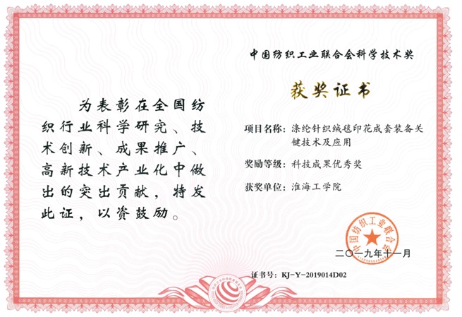 由中国纺织工业联合会主办,纺织之光科技教育基金会协办的“纺织之光”2019年度中国纺织工业联合会科学技术奖日前揭晓。我校“先进材料与装备”科研团队参与申报的科技成果——“涤纶针织绒毯印花成套装备关键技术及应用”荣获科技成果优秀奖。该成果创新性地开发了一种全自动干燥固色一体化系统和一套多循环低耗能的水洗系统,提高了固色的稳定性和水洗轧辊的耐疲劳性。项目成果在江苏鹰游纺机有限公司成功应用两年以来,已取得了较为显著的经济效益和社会效益。