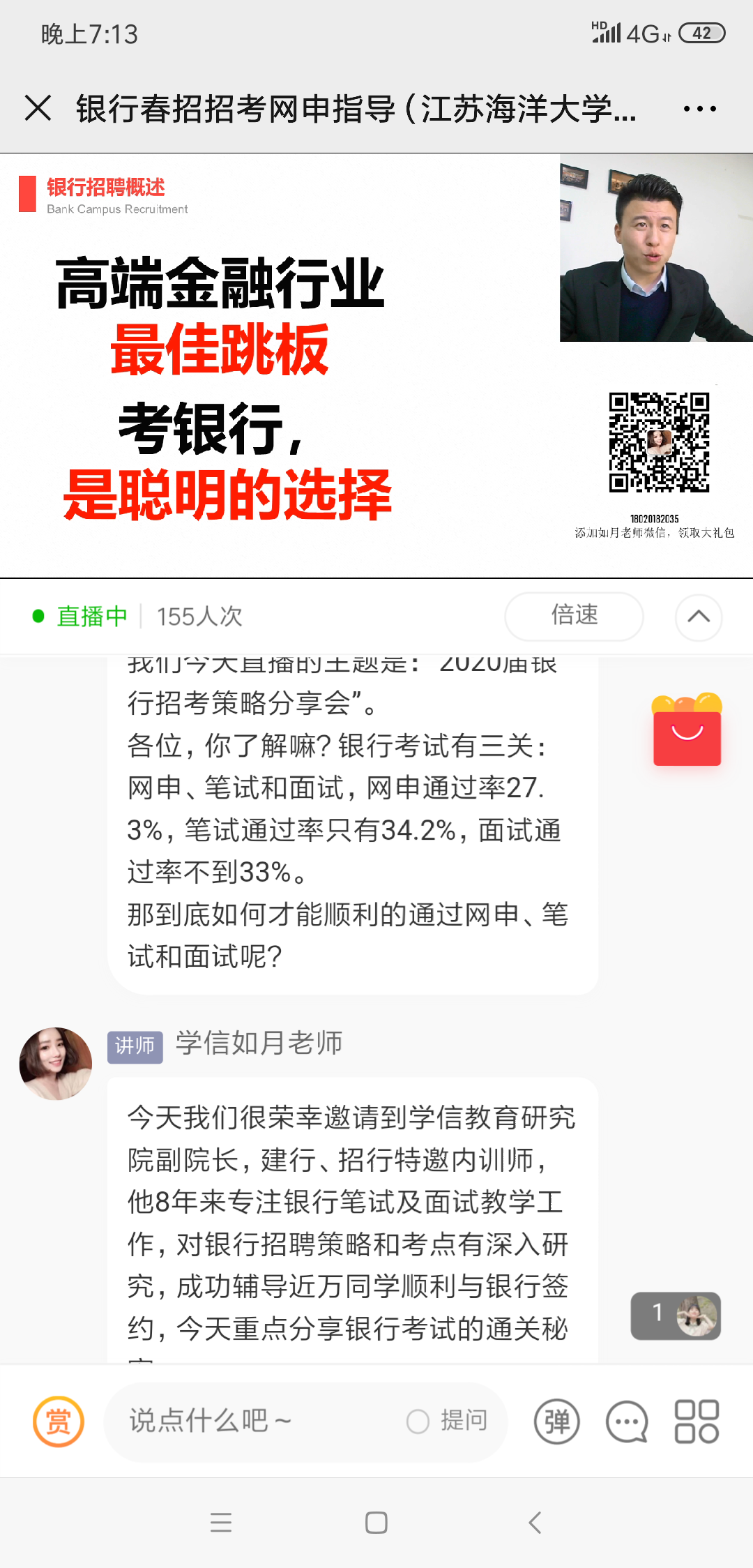 梅高翔老师专注银行笔试及面试教学工作,对银行招聘策略和考点有深入研究,成功辅导近万学生顺利与银行签约。本次培训会重点围绕招聘信息发布、网申、笔试、面试、体检和签约几个方面做了分享。梅老师用幽默、生动的语言,鲜明的案例分享、现场互动提问等多种方式,把银行考试通关经验有效的传递给了同学们。同学们均感到受益匪浅。