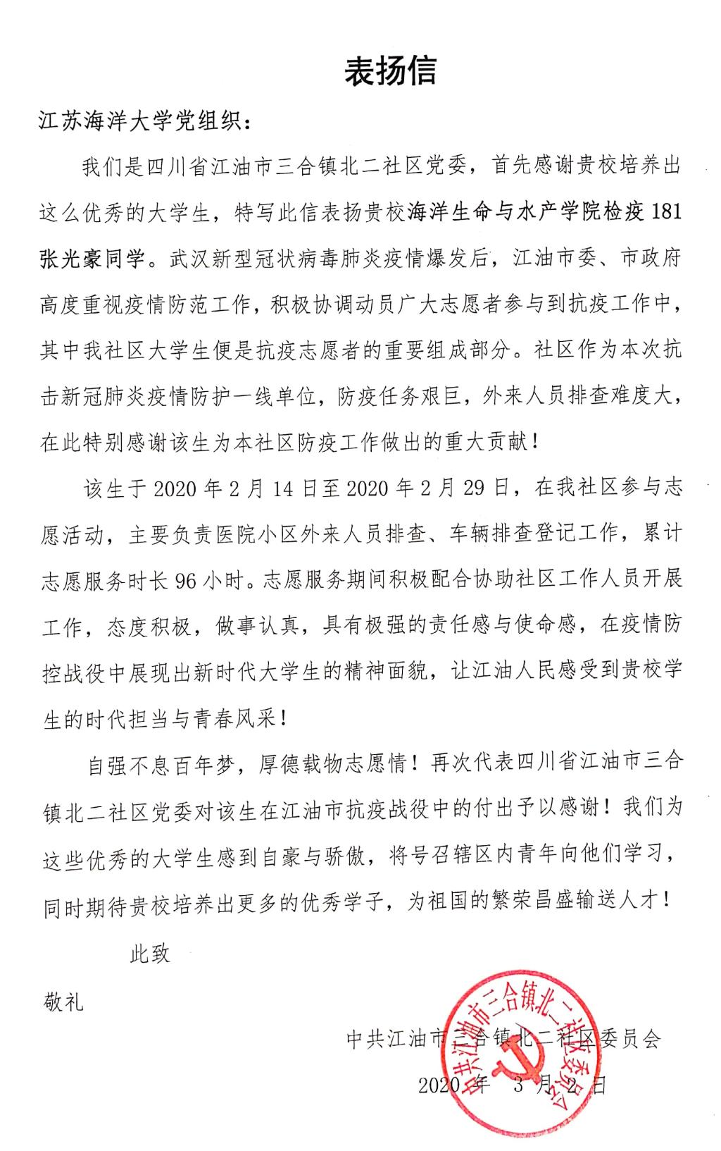 鉴于张光豪同学的优异表现,江油市三合镇北二社区特向我校寄来表扬信,全文如下: