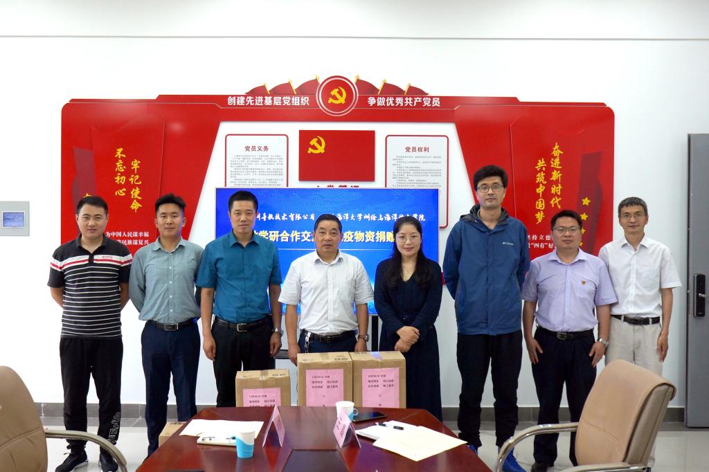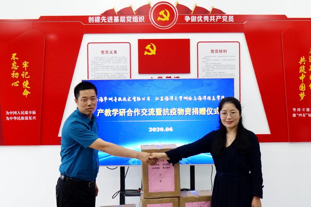 交流会后,高地振还代表公司向测绘与海洋信息学院捐赠了2000个口罩、20瓶2升装酒精、10瓶5公斤装84消毒液等抗击新型冠状病毒感染肺炎防疫物资,王晶接受捐赠并致答谢词。