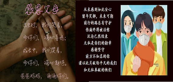 本次活动征集了心理征文、书法、心理微视频、摄影作品共计20件,遴选出8件优秀作品上报校心理健康教育中心。作品中同学们用真挚的语言、灵动的笔墨、炫彩的镜头表达对父母的感恩之情、孝敬之心,表达对奋斗着为抗击疫情的逆行者爱和敬佩,传递真挚的赤子情怀。