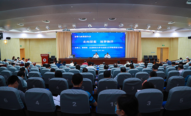 7月3日下午,江苏科技大学马克思主义学院党总支书记郭昭昭在会议中心黄海厅以“走向深蓝,逐梦海洋”为题为我校教师作课程思政辅导报告。校领导王自力、史顺良以及有关职能部门负责人、课程思政示范课程负责人、马克思主义学院、商学院、文法学院、海洋生命与水产学院教师参加了报告会,报告会由马克思主义学院党总支书记张学武主持。