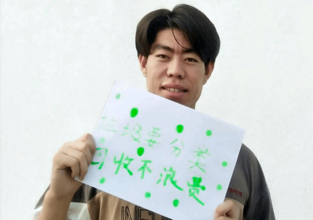 志愿者张晓阳手举宣传标语呼吁大家垃圾分类