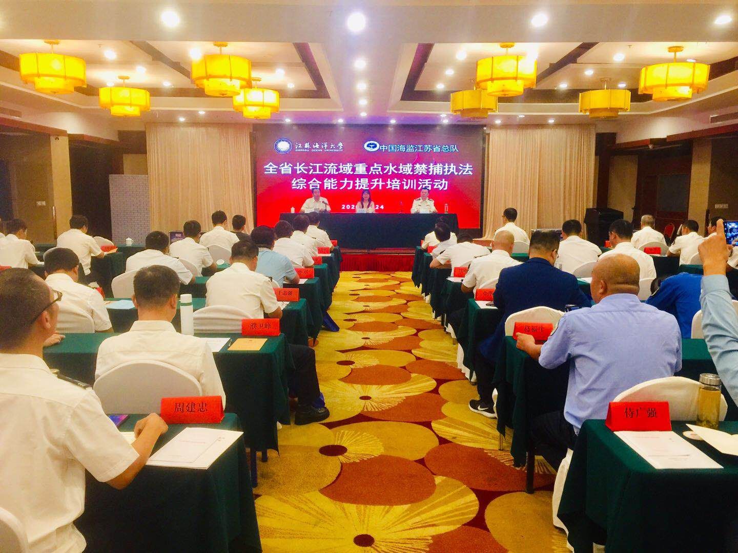 江苏海洋大学继续教育学院与中国海监江苏省总队合作举办“全省长江流域重点水域禁捕执法综合能力提升”培训班。2020年9月24日上午,在连云港市明珠开君国际酒店举行开班典礼,江苏海洋大学副校长金芙蓉出席并致辞,中国海监江苏省总队政委沈彦作了动员讲话,中国海监江苏省总队领导及来自全省六十多位渔业执法干部参加培训,继续教育学院院长杨凤和主持开班仪式。