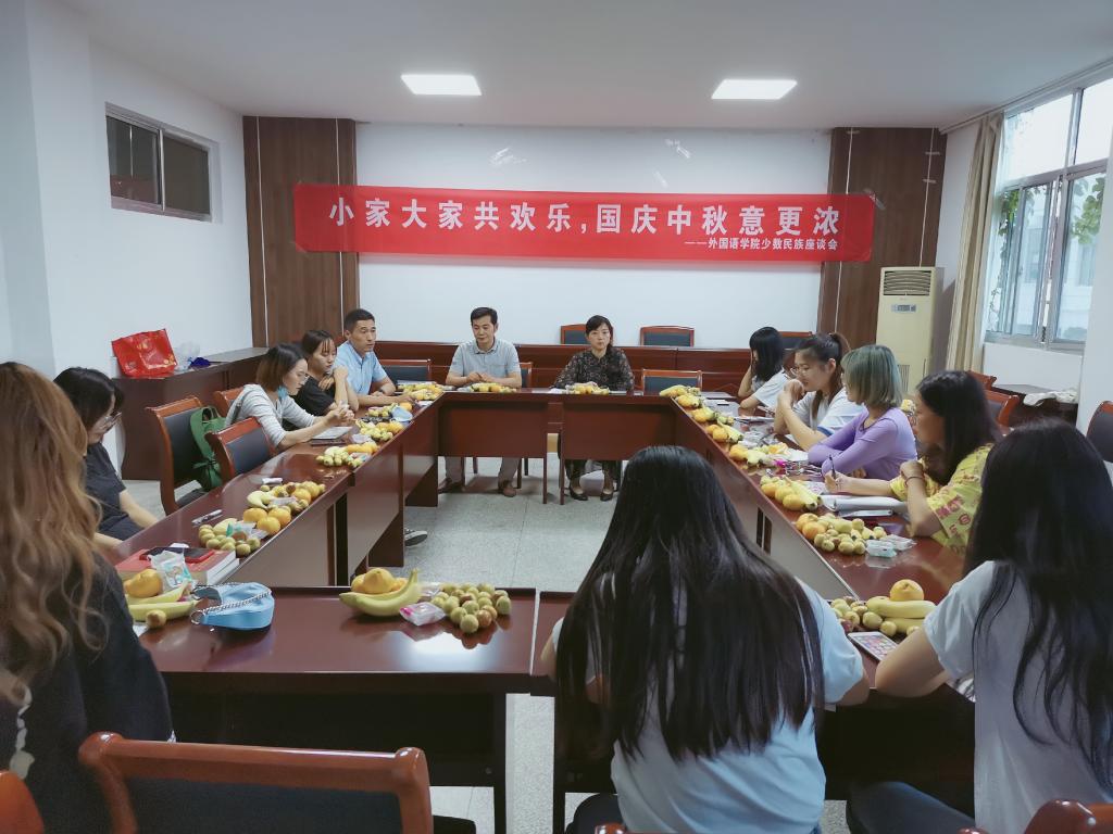 9月29日下午,外国语学院在文渊楼269会议室举行“小家大家共欢乐,国庆中秋意更浓”少数民族学生交流会。学院党委书记徐岚、副书记陆文前,辅导员魏学庆、王熙、曹燕妮,及少数民族学生参加。交流会由魏学庆主持。