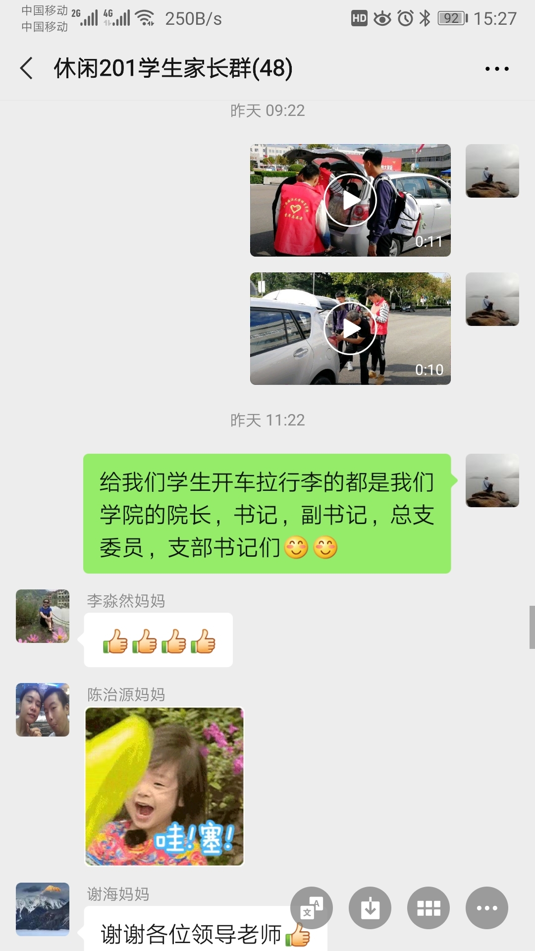老师们主动帮助新同学搬运行李,利用私家车将行李从校门口运送到宿舍楼下,和学生志愿者一起将学生送到宿舍。让新同学感受到 体育学院大家庭的温暖。新生家长群中家长们纷纷为参与迎新的师生们点赞、留言。一位新生家长站在校门口,看到学院老师及志愿者热情的服务,湿润着眼睛说:“我刚刚送儿子来学校,儿子的学长到大门口帮儿子拿行李,好暖心,感谢所有的老师和学长,你们辛苦了。”