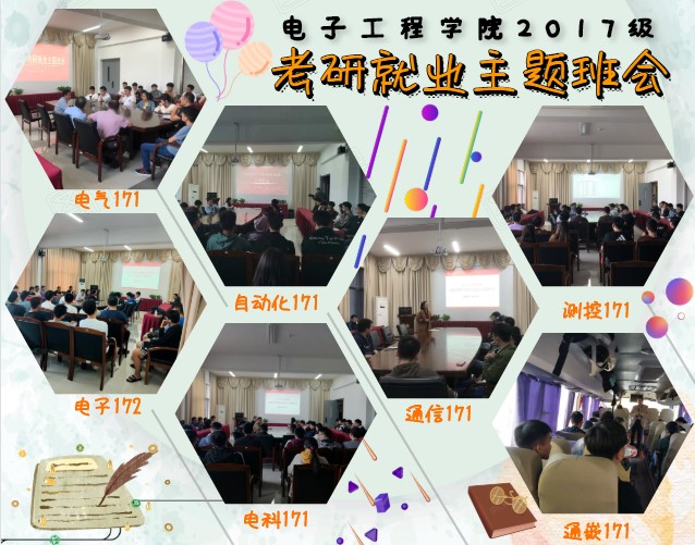 9月底至10月初电子工程学院为2017级各班设计安排了特别的职业生涯规划与就业指导课——“抓考研促就业”主题班会,班会由学院党委书记马志同主讲,党委副书记张玲主持,各班辅导员、班主任老师和全体同学积极投身此次活动。
