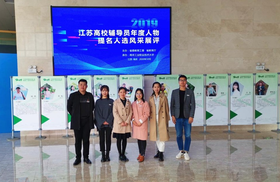 10月18日,“2019江苏高校辅导员年度人物、江苏省大学生年度人物”提名人选风采展评在南京工业职业技术大学举行。我校文法学院辅导员蒋莹莹老师获“2019江苏高校辅导员年度人物”入围奖,药学院2017级本科生郑卫同学获“2019江苏省大学生年度人物”入围奖。我校组织6位辅导员现场观摩提名人选风采展评。