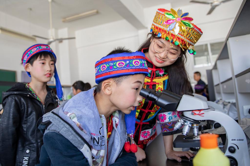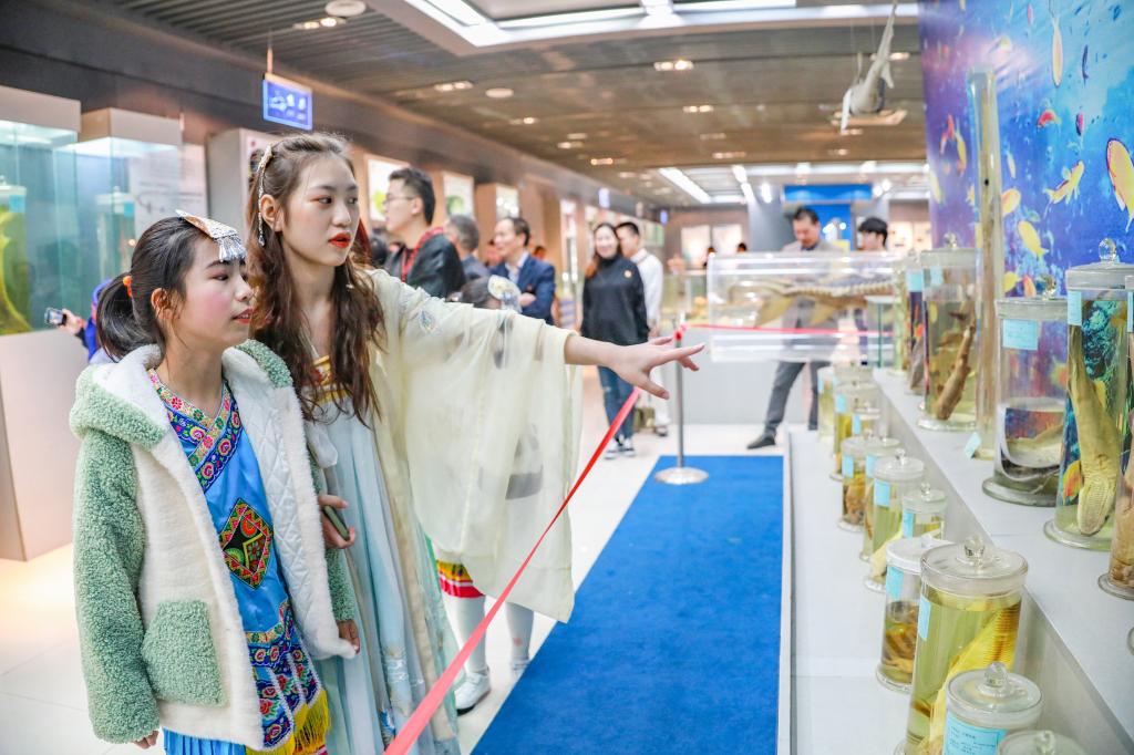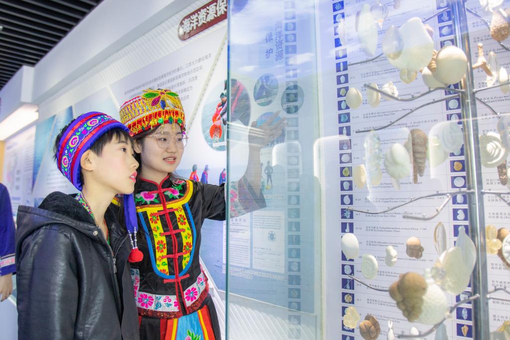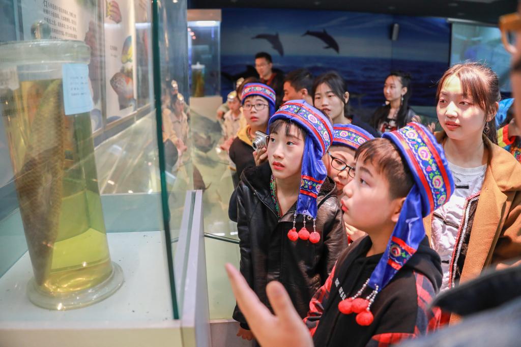 两校少数民族师生手牵手,先后参观我校海洋经济与文化研究中心、海洋馆、海洋科学与水产学院实验中心,以及水族箱造景工作室。“源远流长、波澜壮阔的海洋文明画卷”“丰富的馆藏标本”“海洋生物资源保护与利用”“海水养殖环境与病害防治技术”……在讲解员的详细介绍下,芦蒲民族小学的小朋友们目不暇接,他们一边认真听讲,一边仔细观察、互相交流、体验探索,激发了了解海洋、认识海洋、关注海洋、向往海洋、探索海洋的欲望。