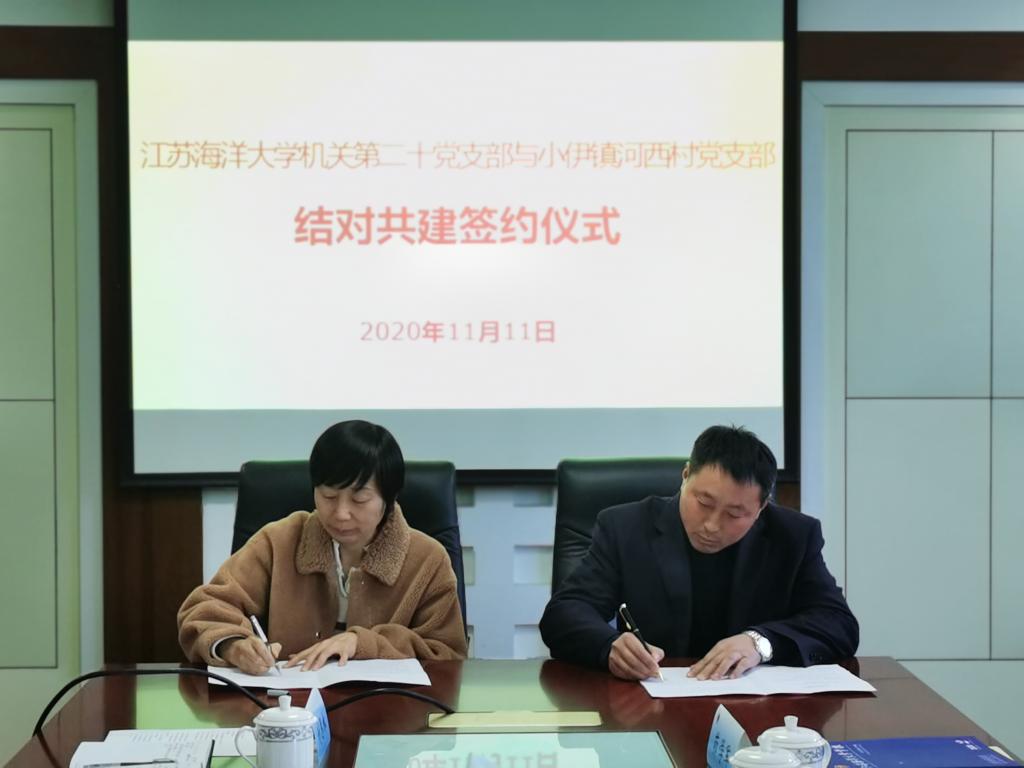 第二十党支部副书记褚金红与小伊镇河西村党支部书记陈华在共建协议书上签字。