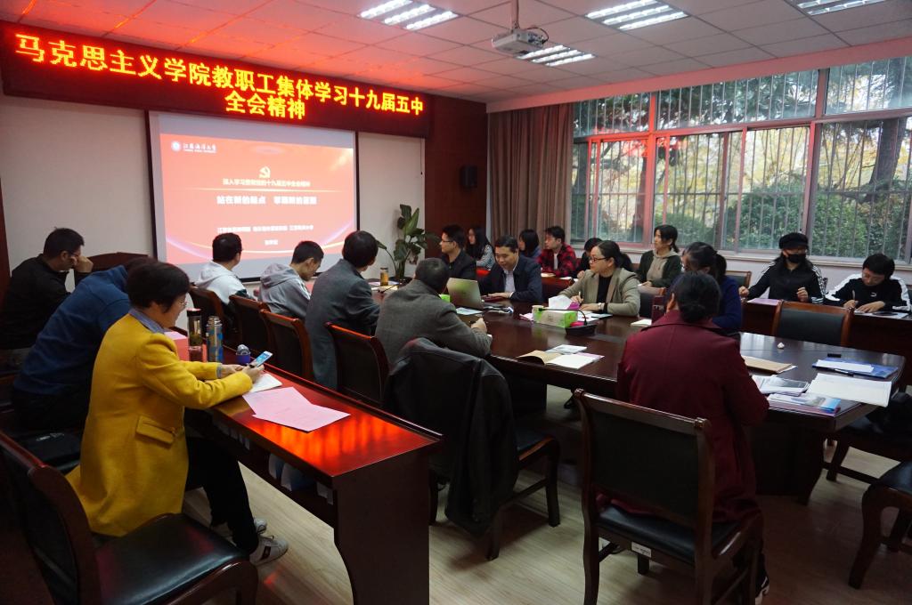 11月18日下午,马克思主义学院教职工集体学习党的十九届五中全会精神,学院党总支书记张学武作专题辅导报告。