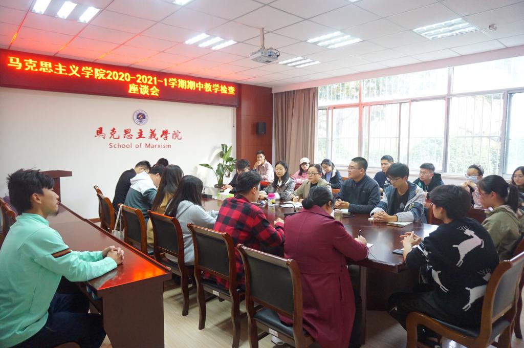 为进一步深化思政课教学改革,提高思政课教学效果,全面了解学生对思政课教学的建议和诉求,11月18日下午,马克思主义学院召开期中教学检查学生座谈会,座谈会由马克思主义学院副院长沈春梅主持,学生代表、教研室主任等参加座谈,。