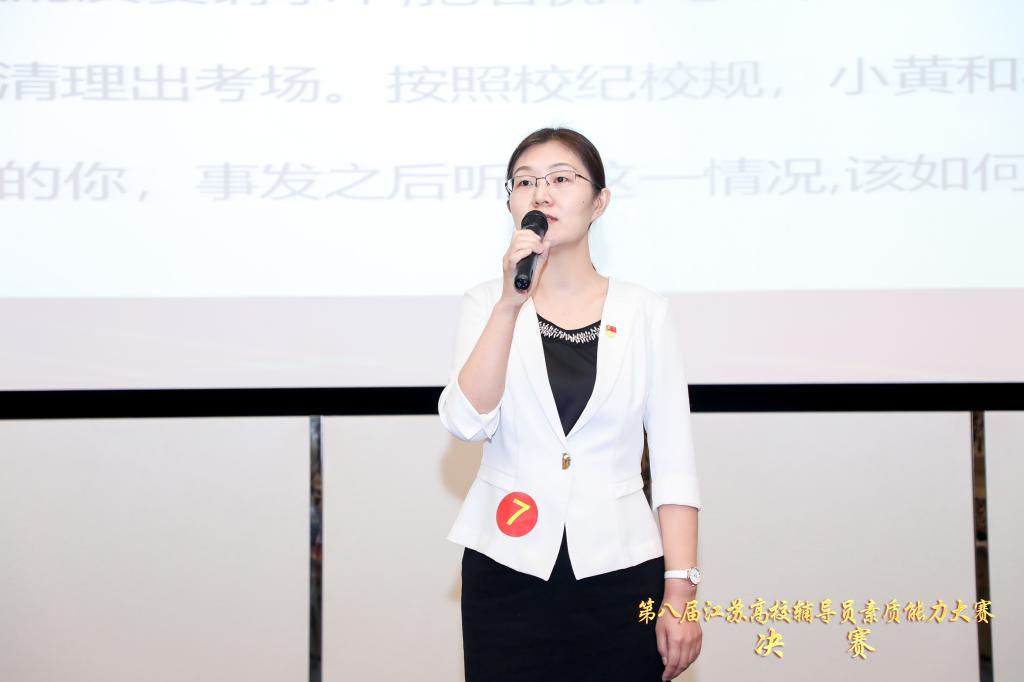 本次江苏高校辅导员素质能力大赛的赛程分为各校校内赛、各片区基地赛和总决赛。经过激烈角逐和层层选拔,40名来自全省各高校的选手脱颖而出,进入决赛。我校辅导员蒋莹莹老师在决赛中荣获三等奖,实现了我校在该赛事上的进步和突破,为我校争得了荣誉。