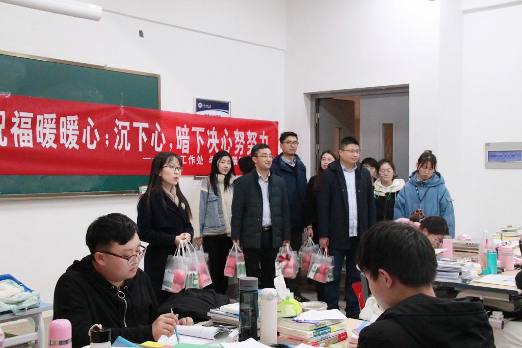在文思楼,原本静悄悄的考研教室因为老师们的到来,瞬间热闹起来,复习一天已经有些疲惫的同学们拿着满含情谊的慰问品,俏皮地表示:“有学校加持助力,我还能学!”教室里空调吹出来的暖风与心间的暖意一同悄悄流淌。