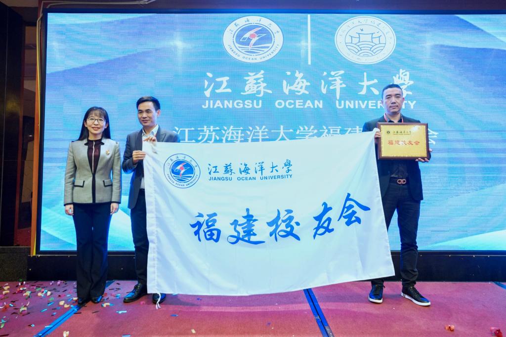 在欢快的进行曲中,金芙蓉向林文胜颁发了会长聘书,并向福建校友会授予江苏海洋大学福建校友会会牌和会旗。