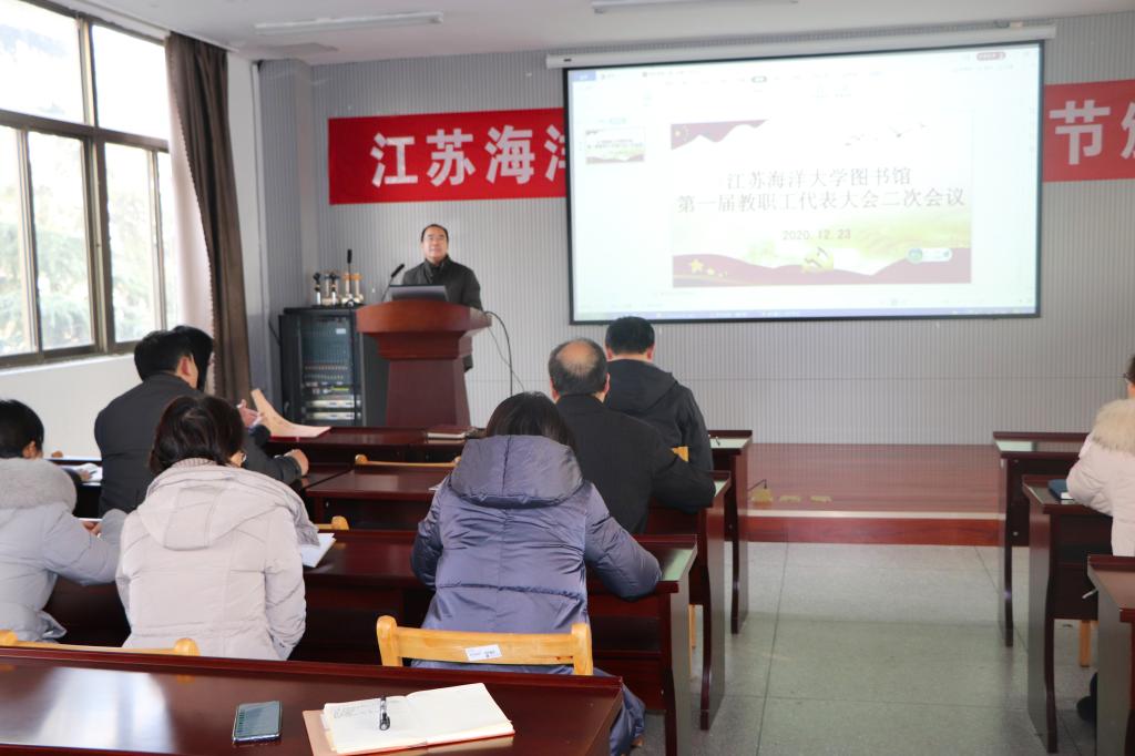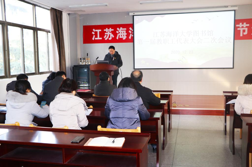 会议在庄严的国歌声中拉开序幕。会上,图书馆馆长曹伟平作了《图书馆2020年工作报告》《图书馆2020年财务预算执行情况报告》,总结了图书馆2020年主要工作以及财务收支情况,过去一年各项工作取得的成绩,分析了存在的问题,提出了创新查新服务模式、加强管理、改进工作作风等改进的措施,并对图书馆2021年“我阅读,你买单”阅读模式、信息素养专题培训、第三届江苏海洋大学读书节、建党100周年党建专题展览等工作进行部署。图书馆副馆长、分工会主席艾华作《图书馆分工会2020年工作报告》。会议表决审议并通过了以上三个报告。
