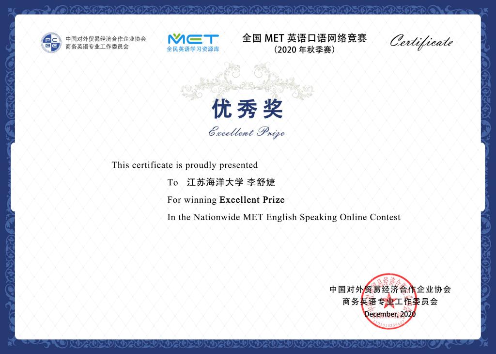 近日,全国MET英语口语网络竞赛·2020年秋季赛落下帷幕。本届大赛我校来自不同系院的41位同学参加了角逐。其中来自我校应用技术学院的李舒婕同学以总分280.37分的好成绩获得大赛优秀奖。同时,16位同学总成绩超过180分,获得申请"国际商务英语口语能力证书"资格。