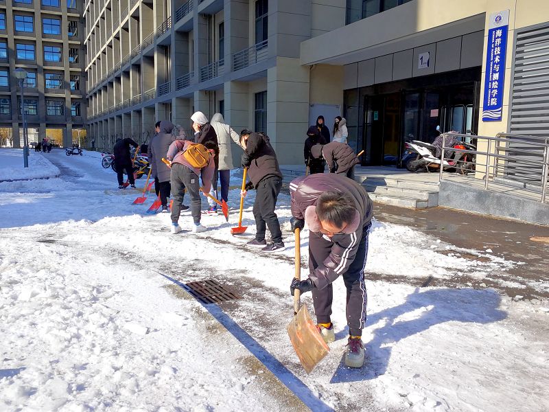 土木与港海工程学院辅导员黄媛带领10几名学生干部和研究生,用铁锹为土木楼下开辟一条“安全通道”。海洋技术与测绘学院党委组织党员志愿者开展铲雪除冰义务劳动,学院党委书记冯凤麟、党委副书记王晶以及学院老党员带头上阵,带领师生党员对测绘楼前路面堆积的冰雪进行大铲除,共计40余名党员参与此次活动。资产处支部党员自发地组织起除冰小分队,在兴海楼小广场,全体党员不畏严寒,不辞辛苦,挥舞着铁锹等劳动工具,清扫道路上的积雪。