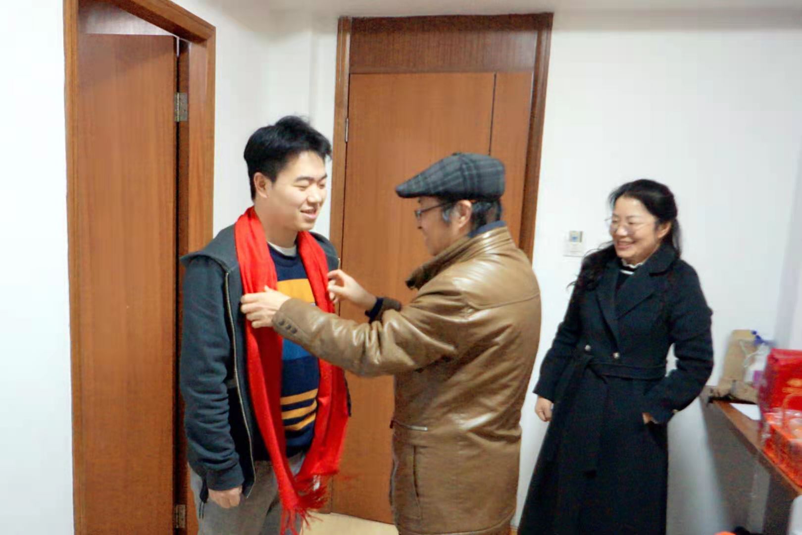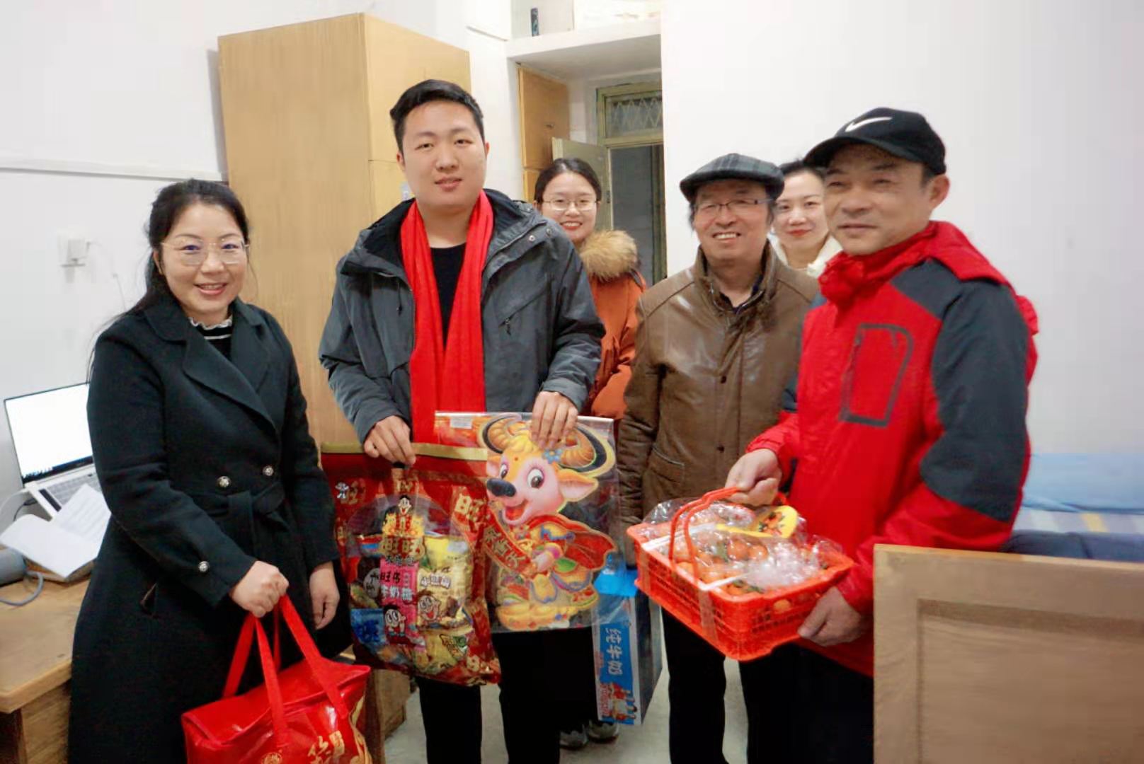 老师们为留校过年的河北籍学生和留学生准备了牛奶、水果、点心等暖心大礼包,亲自为他们围上大红喜庆的围巾,张贴“牛气冲天”的年画,王晶还专门制作了香喷喷的大肉饼。每到一处,老师们和留校生亲切攀谈,嘘寒问暖,捎去新春的问候和祝福,让他们感受到家庭般的温馨。