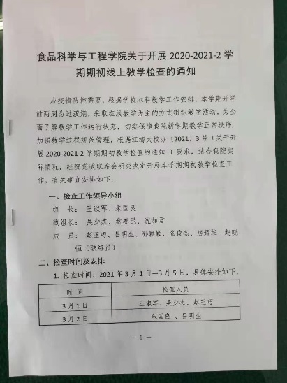 食品科学与工程学院成立以院长、党总支书记为组长、学院教学督导为主要成员的期初线上教学检查工作领导小组。对期初线上教学工作进行了具体分工,每日安排一名学院领导负责,做到每门课程必覆盖听课,学院领导至少听2次课,学院副书记、班主任等深入宿舍,认真检查督促学生线上听课。学生都能够按时实名加入相应的教学群,准时进入课堂,教师能够自觉加强考勤;课堂秩序良好,部分教师都能够结合课堂所授内容,开展思想教育,取得了较好的效果。