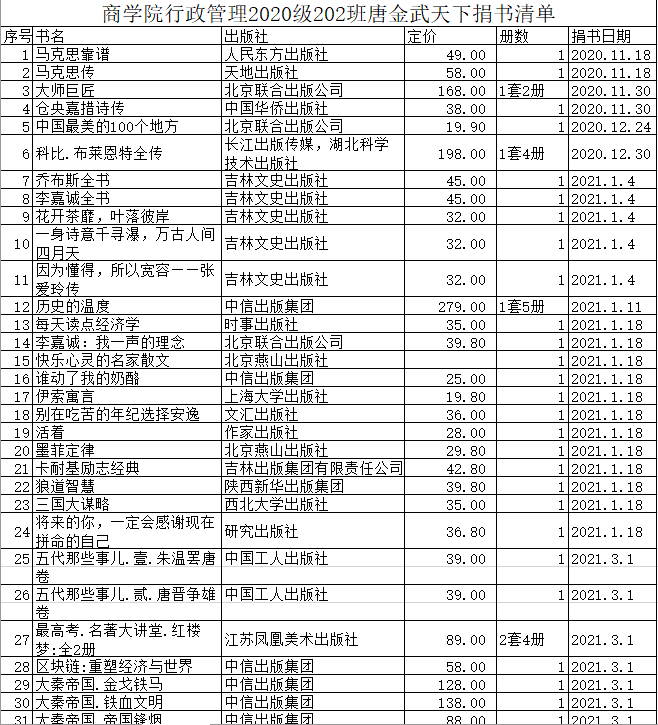 据悉,唐金武同学共捐赠图书总计56册,涵盖历史人文、社会文学、经济法律、文学名著等。唐金武同学表示,希望为进一步丰富我校图书馆在文化理论、文学名著、全书类书等多方面的文献收藏贡献自己的力量。同时期望这些图书能够惠及更多读者,让校园氤氲书香。捐赠的图书中,有普及科学知识的《相对论》,有教育部制定课外阅读名著《红楼梦》,有励志的《别在吃苦的年纪选择安逸》《卡耐基励志经典》等等。