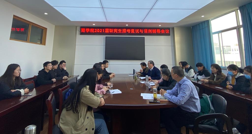 为助力2021届考研上线学生更好地准备复试和调剂,提高复试和调剂成功率,3月24日下午,商学院在文渊楼355会议室组织了复试与调剂辅导会。学院党委书记杨天华,院长宣昌勇,商学院全体系主任,以及2021届考研达线学生参加了辅导会,辅导会由学院党委副书记王智金主持。