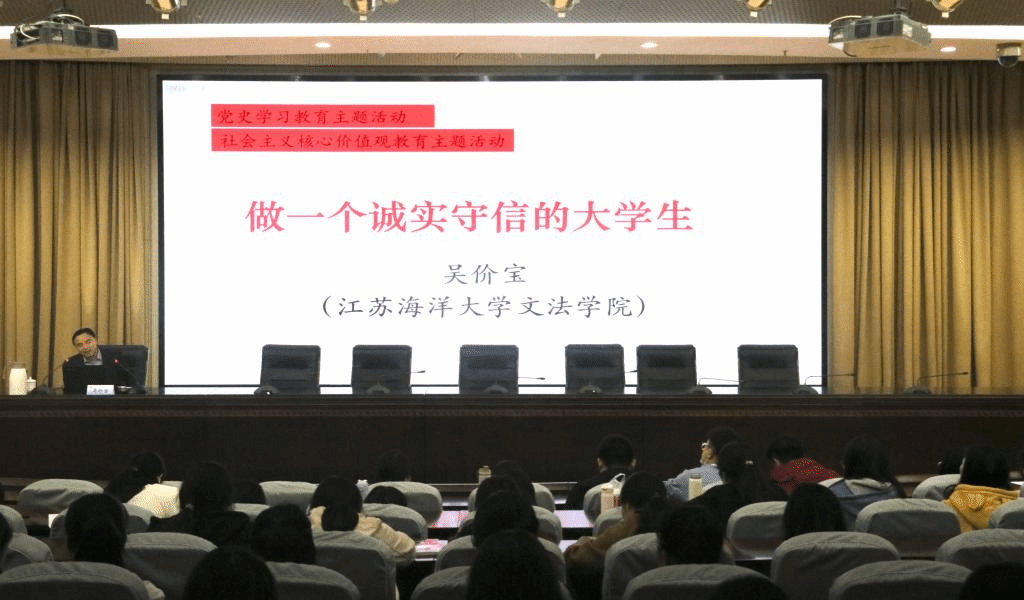 4月22日晚7时,文法学院在会议中心黄海厅举行社会主义核心价值观主题教育报告会。此次报告会的主题是“做一个诚实守信的大学生”,报告会由文法学院党委书记吴价宝教授主讲,并且通过现场学习和网络直播两种形式面向全院学生展开。