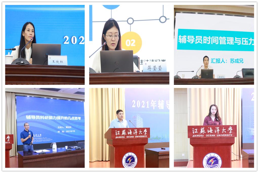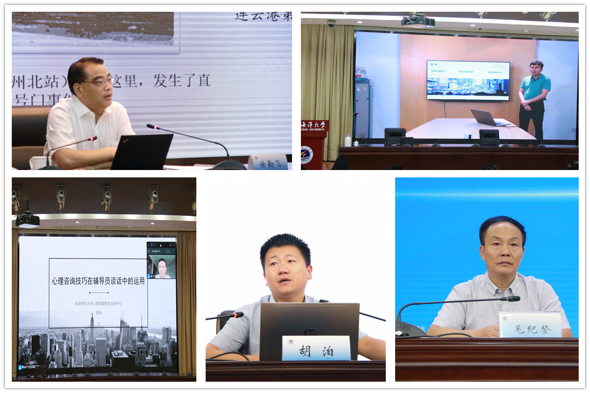 连云港市委党史工作办公室主任徐勤飞做了“巍巍三山展红旗”党史教育讲座,从四个“3”看中国共产党在连云港的奋斗史。南京审计大学心理中心主任蔡智勇教授讲授了“心理危机早期发现和预警”。南京师范大学心理中心主任裴涛教授讲授了“心理咨询技巧在辅导员谈话技术中的作用”。中国矿业大学心理中心教师胡泊博士讲授了“大学生危机干预的应对策略”。我校机械工程学院毛纪登老师结合六个典型案例,阐述应该成为什么样的学生教育工作者。环境与化学工程学院副书记王改红老师结合导师制分享了“如何发挥全员育人的作用”。文法学院蒋莹莹老师解读了《江苏海洋大学校园危机预警及处理工作手册》,其中收录了33个典型案例,是我校辅导员发展与研究中心的重要阶段性成果。商学院苏成兄老师分享了“辅导员的时间管理和压力管理”。海洋科学与水产学院黄治东教授分享了“辅导员的科研能力提升”。本次讲座还开展了分组研讨活动,达到巩固提升的效果,提升了辅导员队伍的政治素质和工作本领。应用技术学院包家官老师,2021年新进辅导员、海洋技术与测绘学院辅导员徐格非作为培训学员代表在总结会上做了交流学习发言,分享工作感悟。