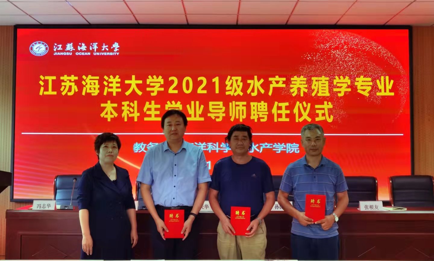 孙国红宣读了《关于聘任江苏海洋大学2021级水产养殖学专业本科生学业导师的决定》,孙国红、杨天华、徐军田共同为23位学业导师颁发了聘书。