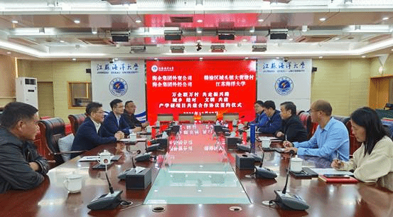 10月27日下午,“万企联万村共走振兴路 城乡结对文明共建”签约仪式在校会议中心东海厅举行。副校长许兴友、江苏省海外企业集团有限公司党委副书记闫国伦、江苏省对外经贸股份有限公司党总支副书记张强、江苏海外集团对外经济技术合作有限公司办公室主任谢冲、江苏省连云港市赣榆区城头镇大黄墩村党支部书记高峰出席签约仪式,海洋科学与水产学院相关领导和老师参加签约仪式。签约仪式由院长徐军田主持。