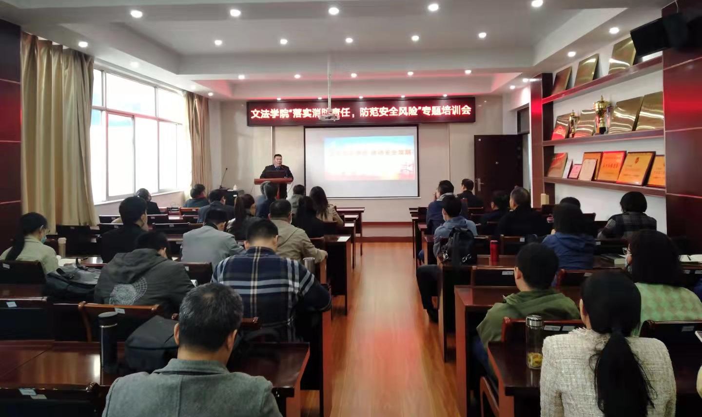 为增强安全防范意识,全面普及新修订的《安全生产法》和《消防法》,进一步做好消防安全工作,10月27日下午,文法学院开展“落实消防责任,防范安全风险”专题培训,特邀请连云港市消防教员殷晓为全院教职工进行消防安全知识培训。