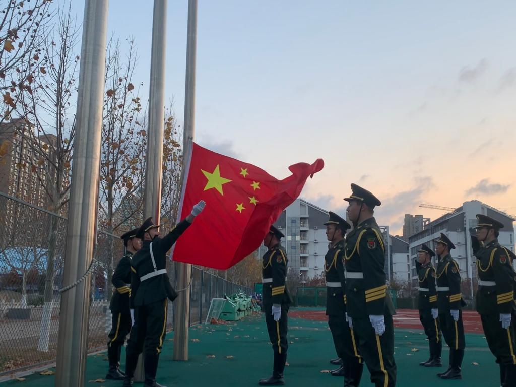 早上7点整,国旗仪仗队队员昂首挺胸,迈着铿锵有力、整齐划一的步伐,护送鲜艳的五星红旗来到升旗台前,在激昂的国歌声中,鲜艳的五星红旗迎着朝阳、冉冉升起。